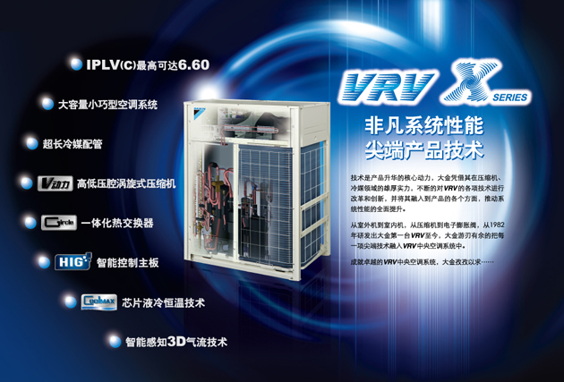 大金变频中央空调——每套由一台室外机(5HP~48HP)匹配若干台(最多可达30台)室内机(0.8HP~10HP)组成——是日本大金工业株式会社研制开发的,目前世界上最先进,最新型、的高智能化的氟利昂直接蒸发式中央空调。